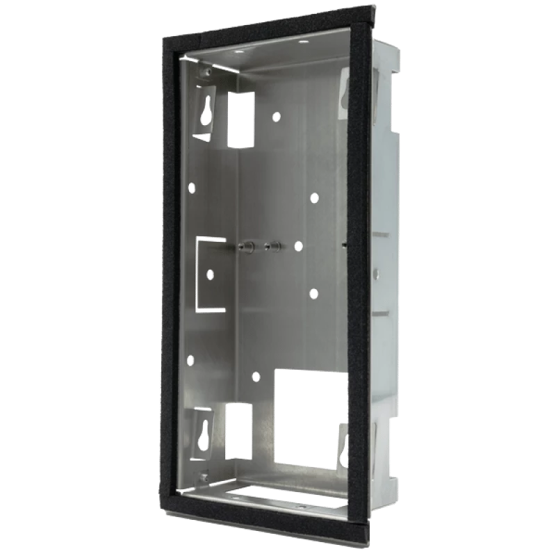 The D2101VFMB from DoorBird is a V2A stainless steel flush-mounted backbox required for installing a D2101V door station.