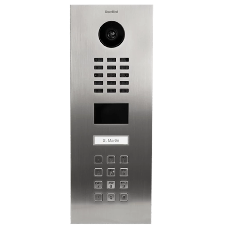 The DoorBird D2101KV is an IP video door intercom with a built-in numeric keypad and RF reader for access control applications such as gates or entrances.
