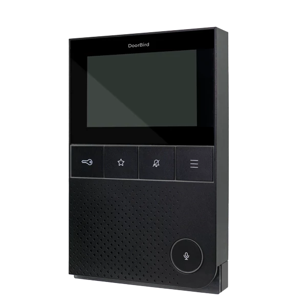 The DoorBird Indoor Station has a touch display made of scratch-resistant tempered Gorilla® glass with an intuitive user interface. It also includes configurable hard buttons with clear symbols for common functions.